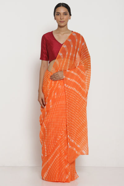 This saree features distinctive tie-dye patterns made by employing the traditional Leheriya technique