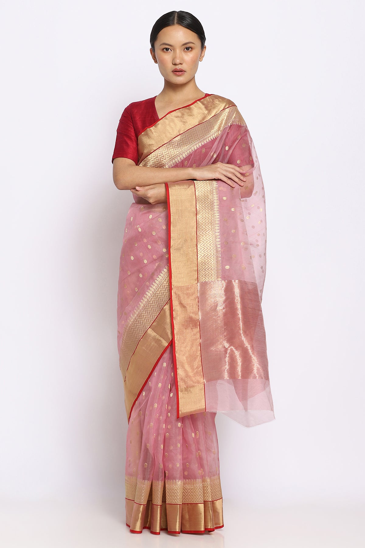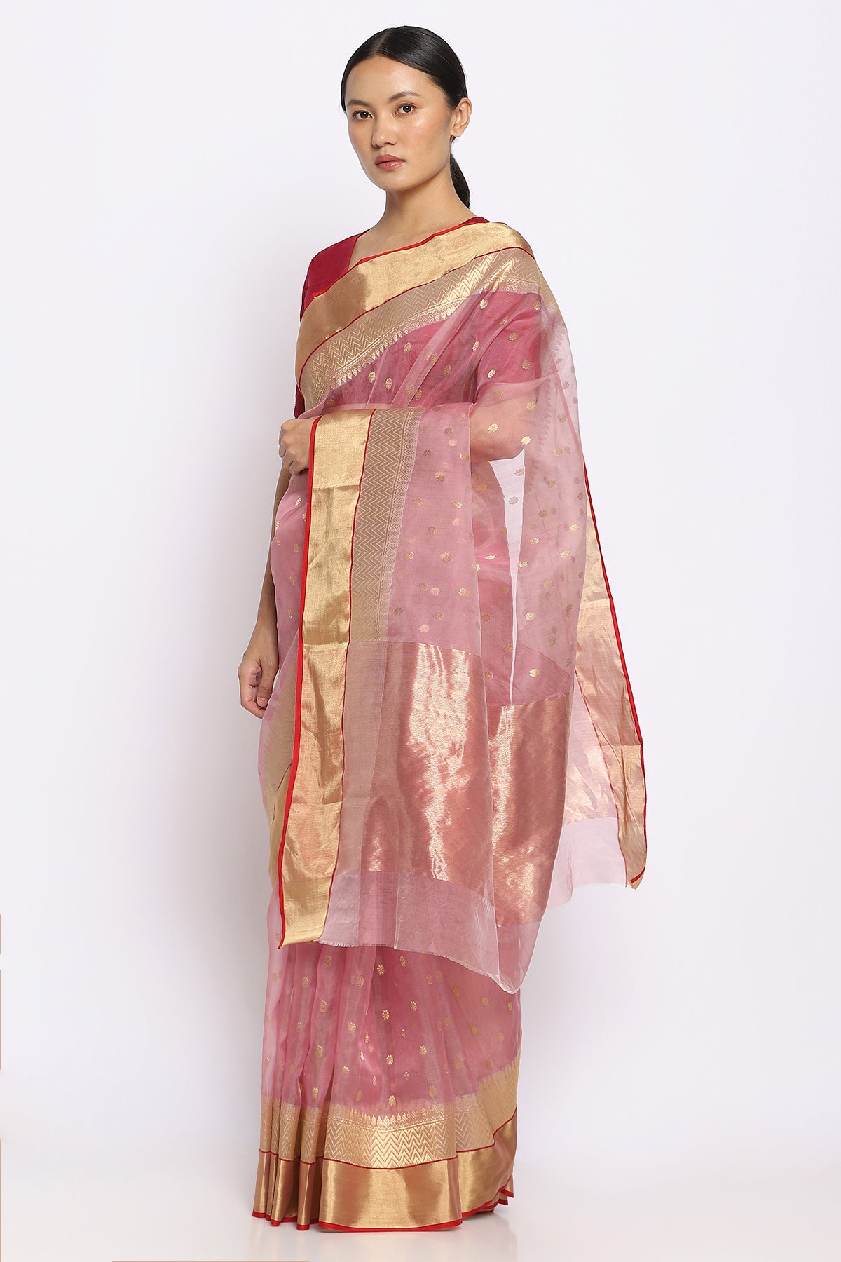 The saree comes with a running blouse measuring approximately 1 meter in length in the same woven fabric as the saree. Blouse worn by model is only for styling.