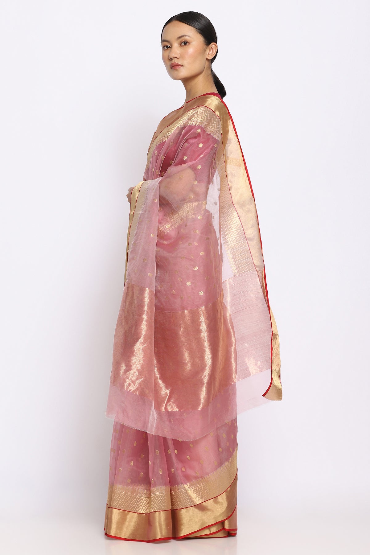 Pure handwoven silk textile with traditional chevron border and small butis woven all over the saree. This saree has been handwoven by artisans in Chanderi.