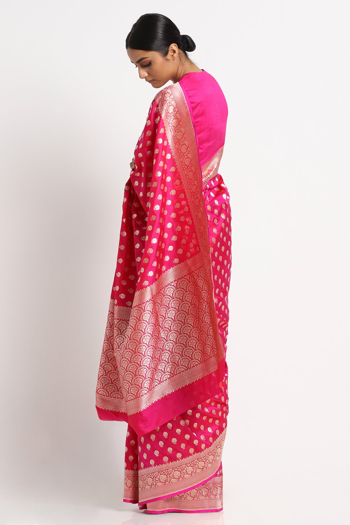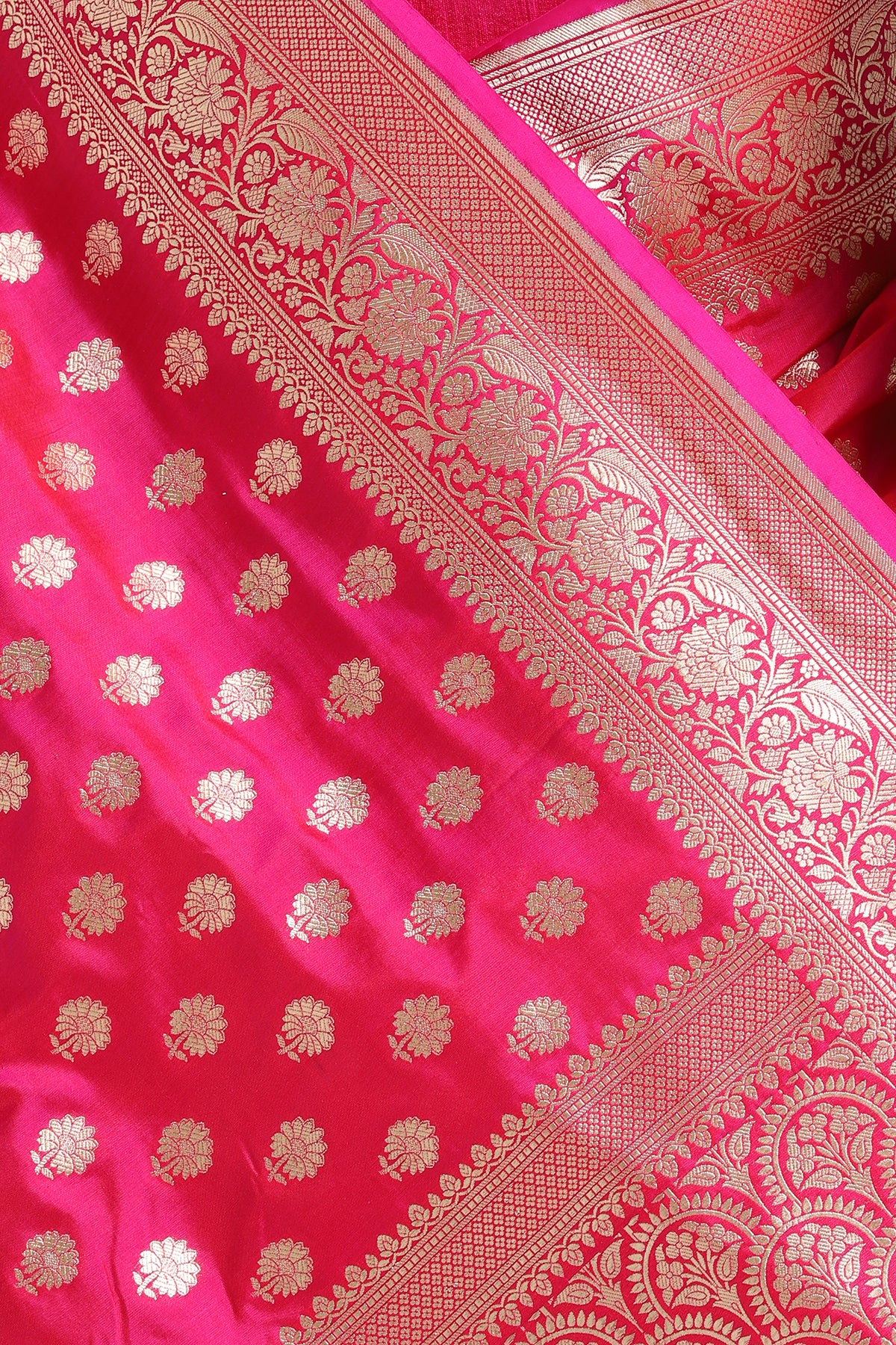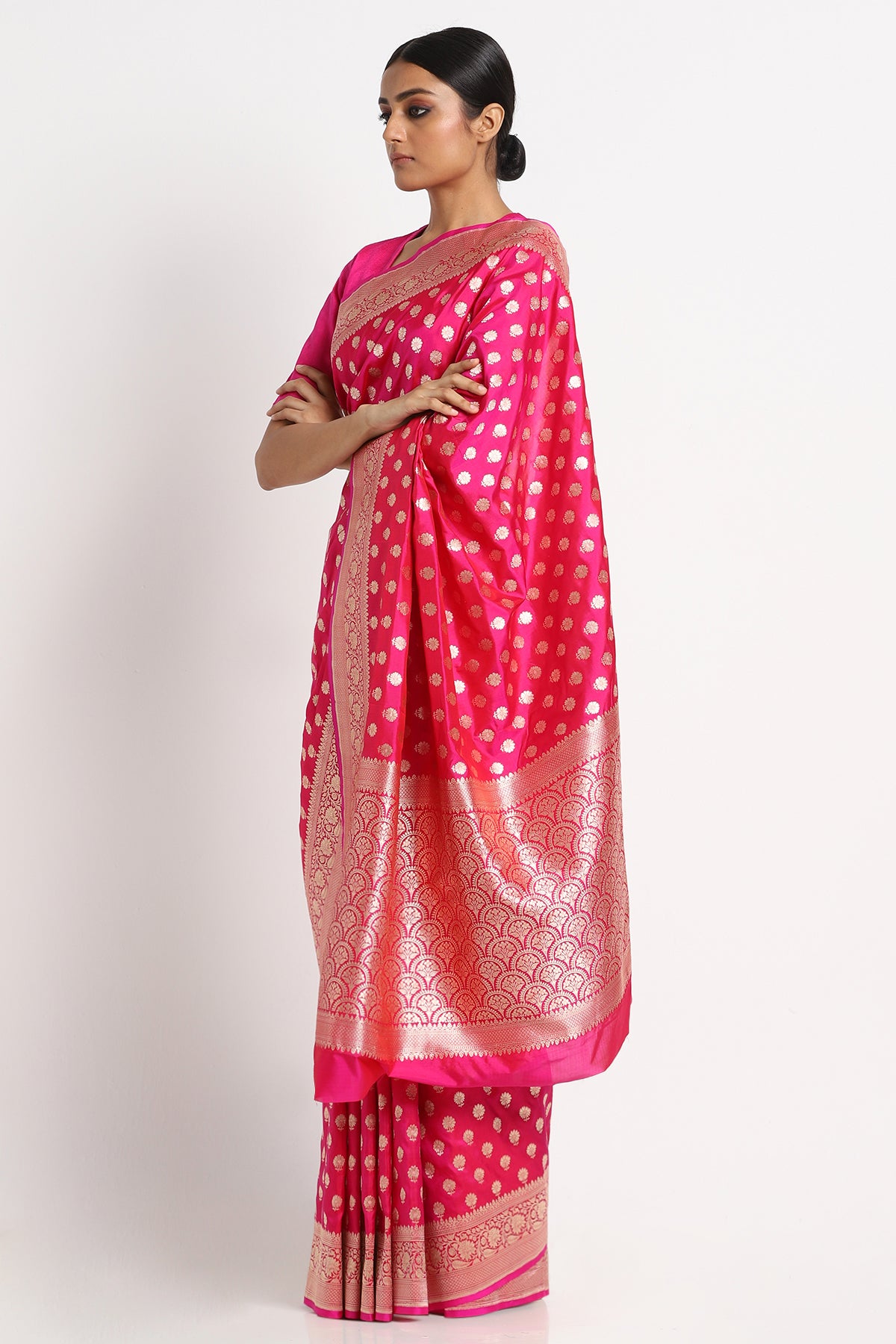 Pure handwoven jewel tone Banarasi textile with all over floral jaal weave on the saree, intricate zari border and pallu. This weave has been hand crafted by artisans in Banaras.