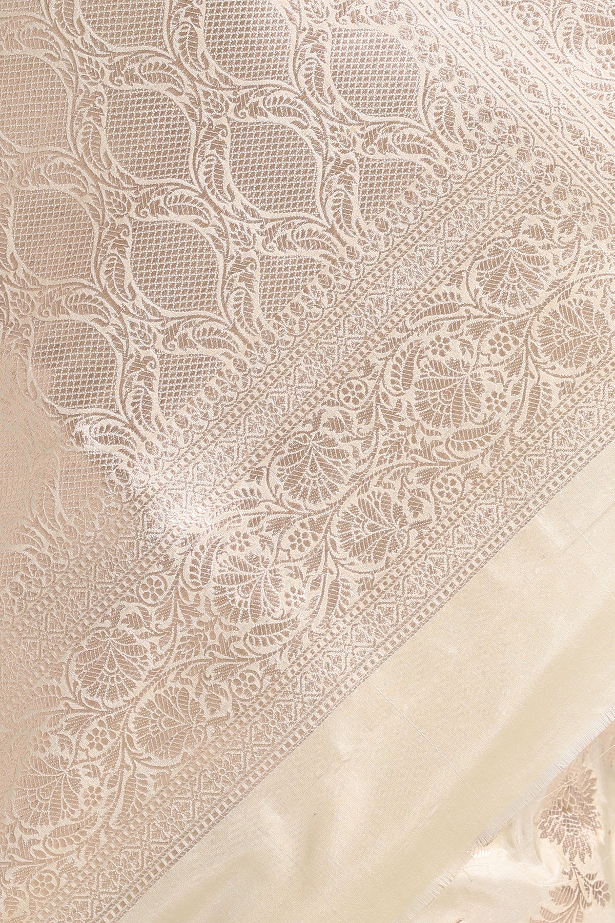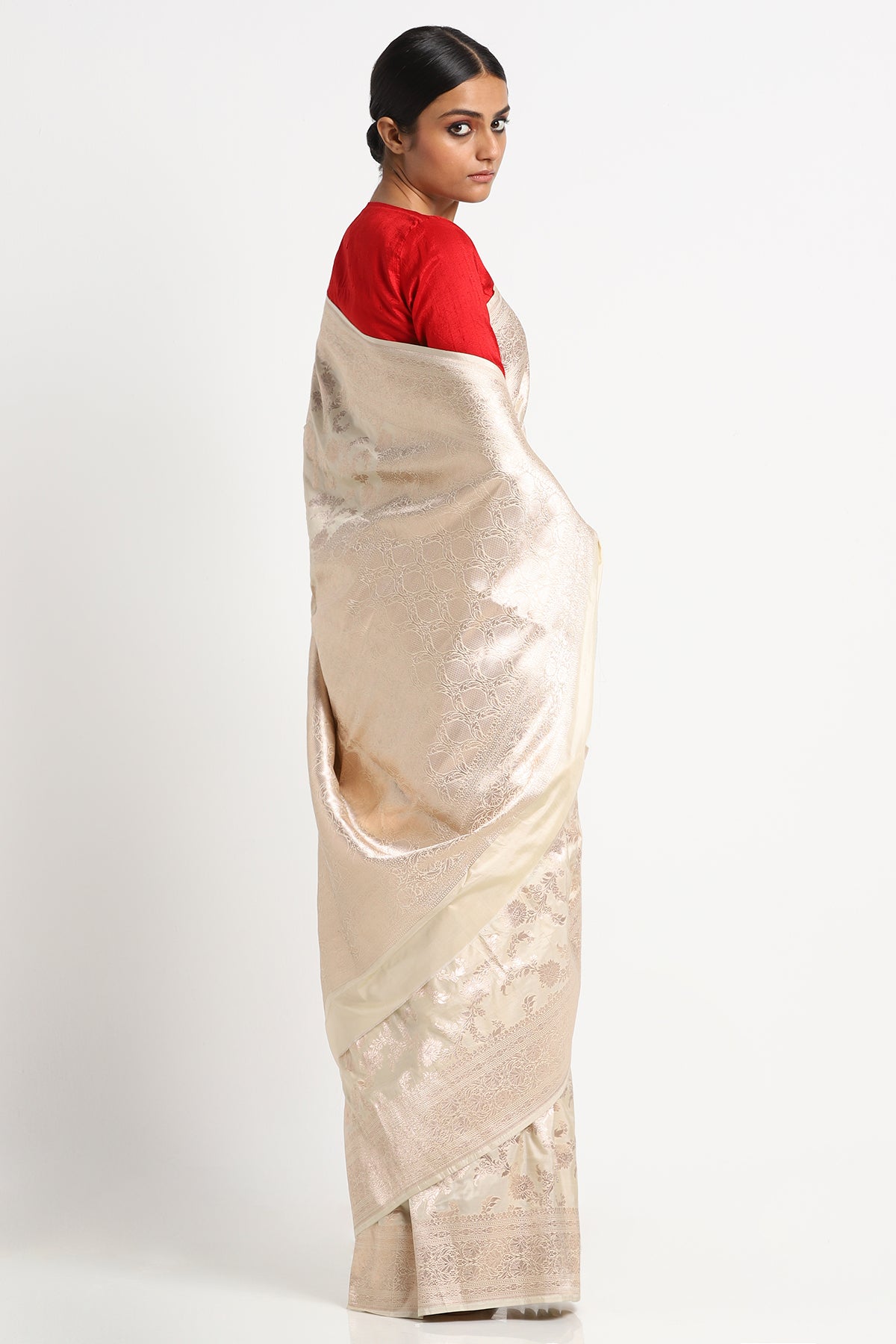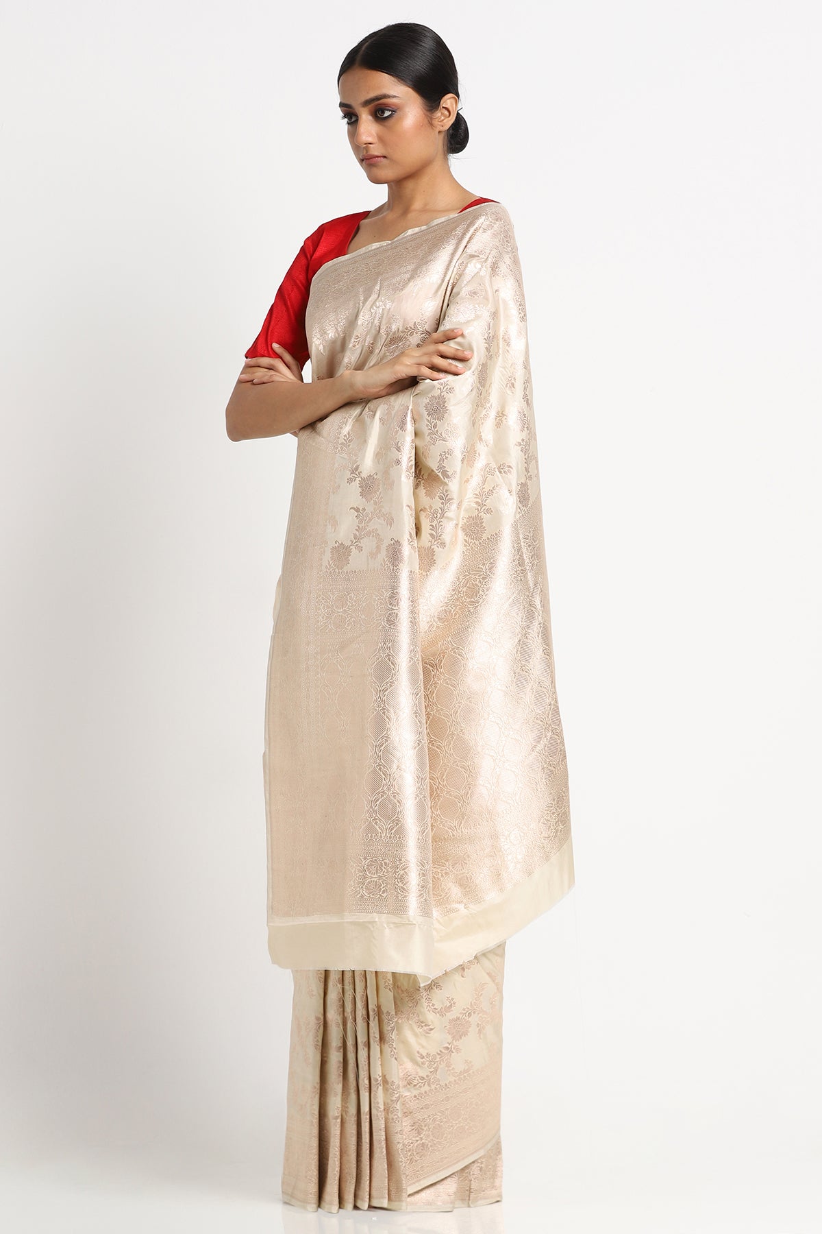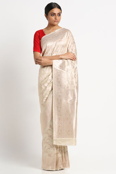 Pure handwoven jewel tone Banarasi textile with all over floral jaal weave on the saree, intricate zari border and pallu. This weave has been hand crafted by artisans in Banaras.