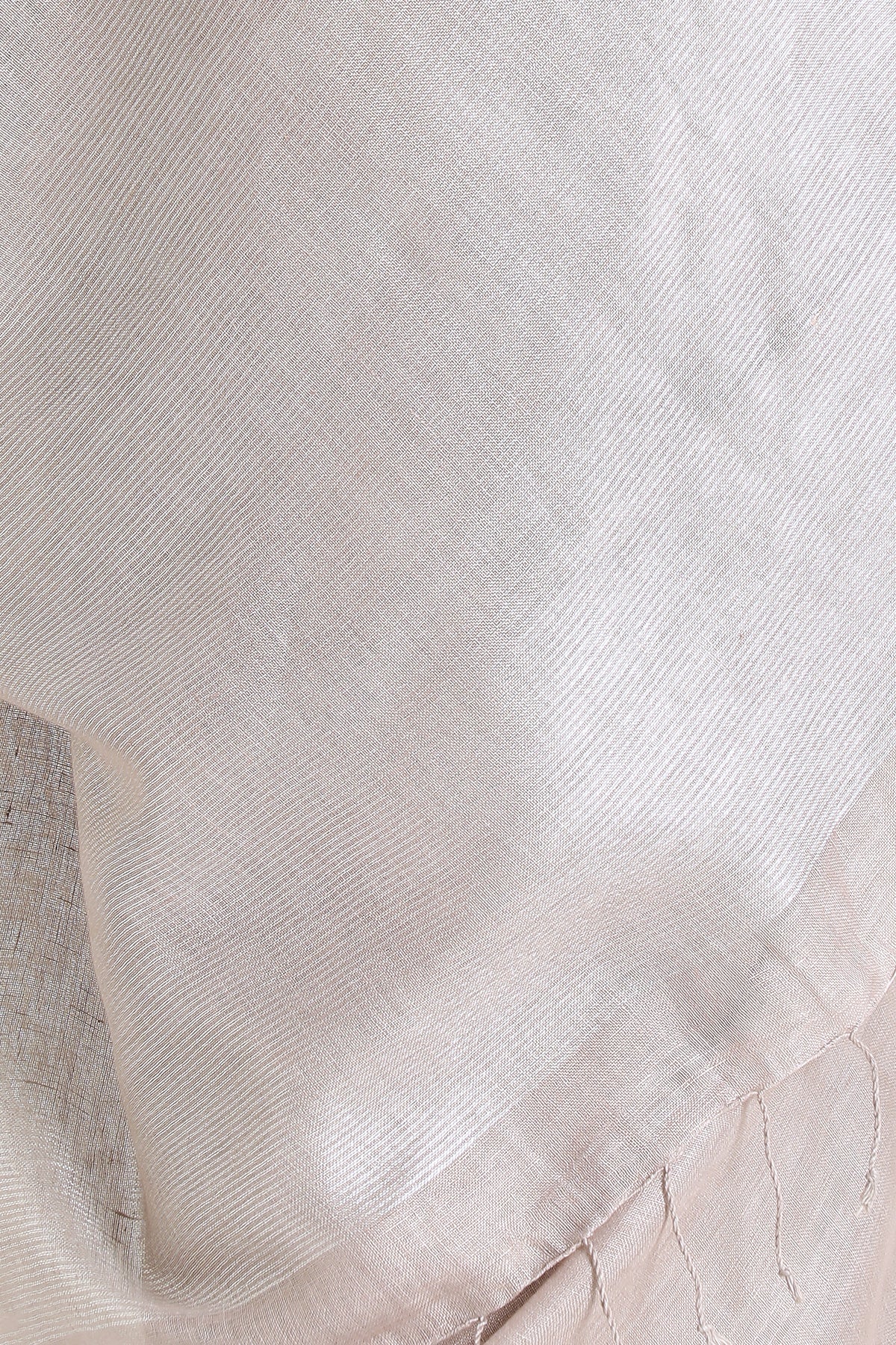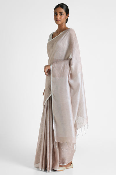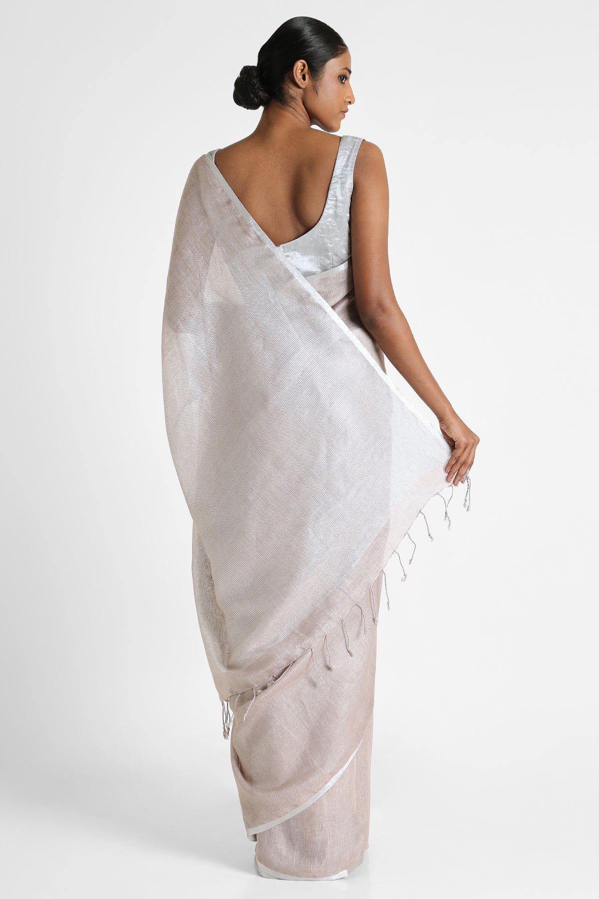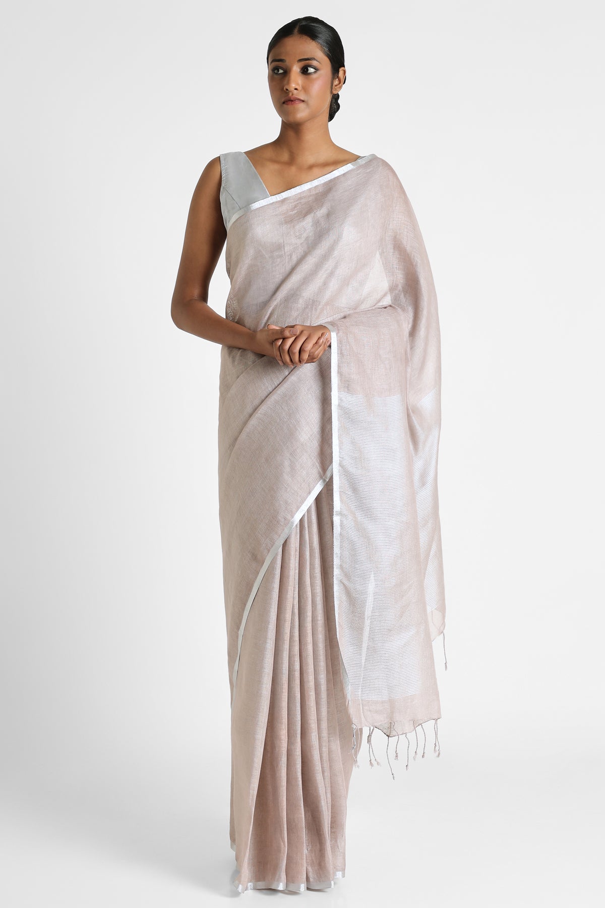 Pure handwoven linen textile with fine zari border and pallu. This saree has been woven by a weaver collective in central India.