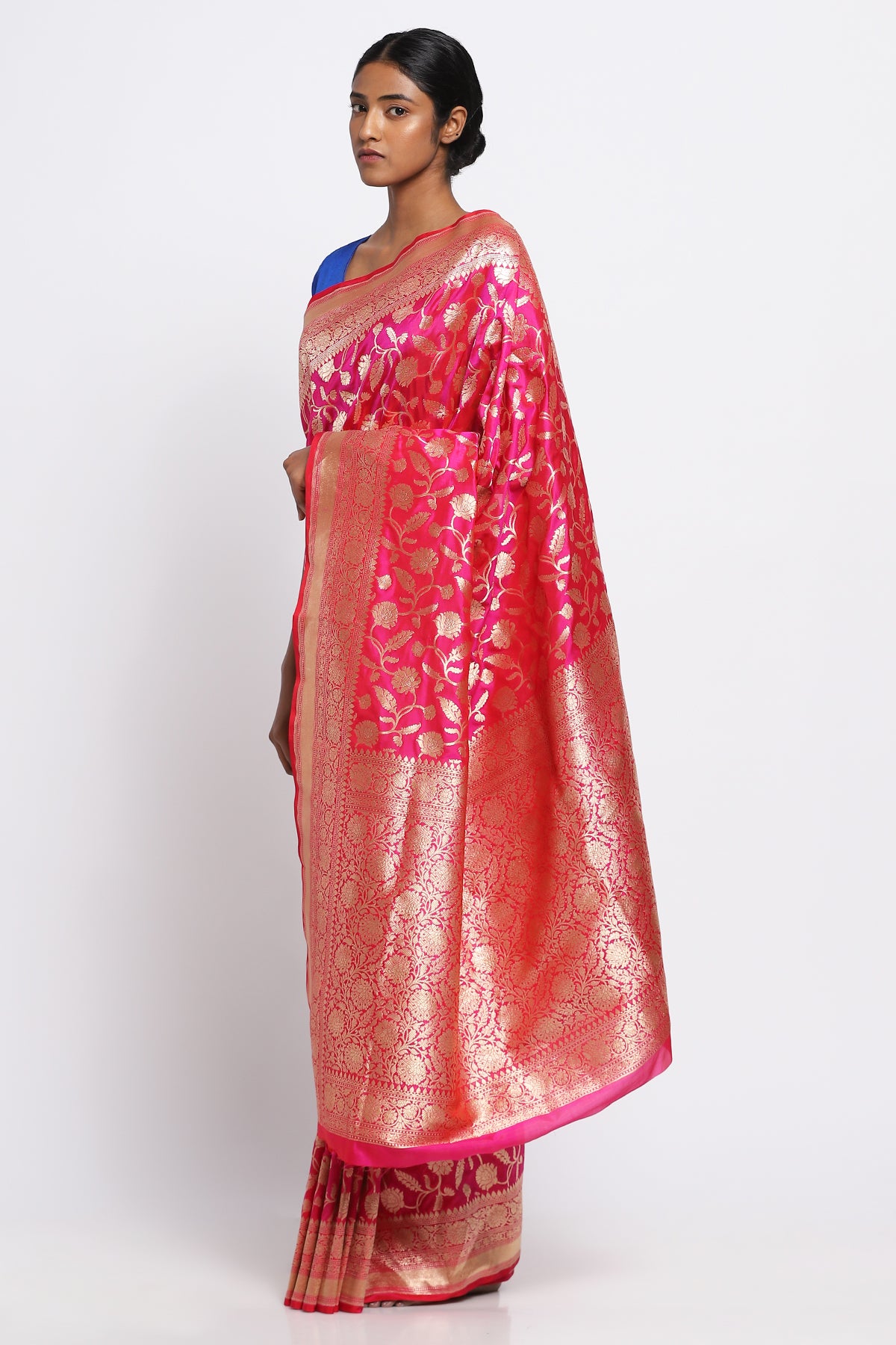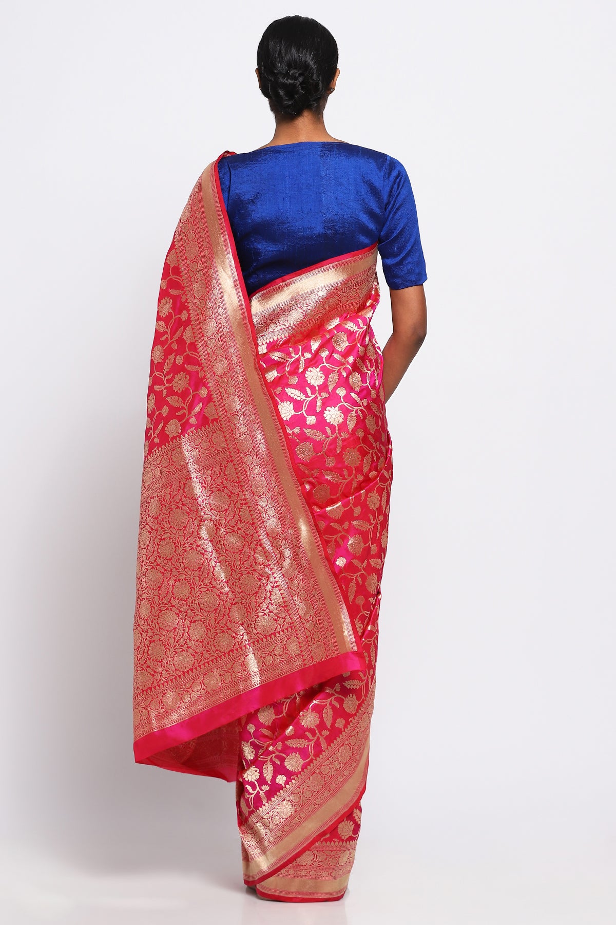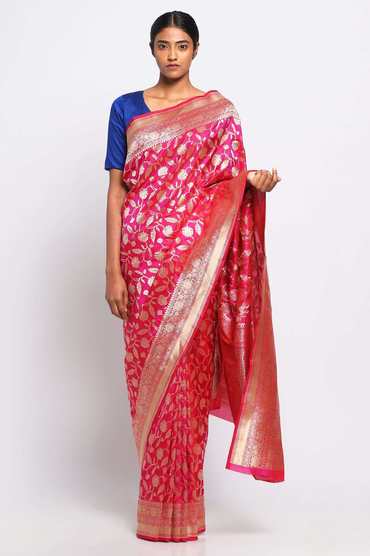 Pure handwoven Banarasi textile with woven floral motifs on the saree, intricate zari border and pallu. This weave has been hand crafted by artisans in Banaras.